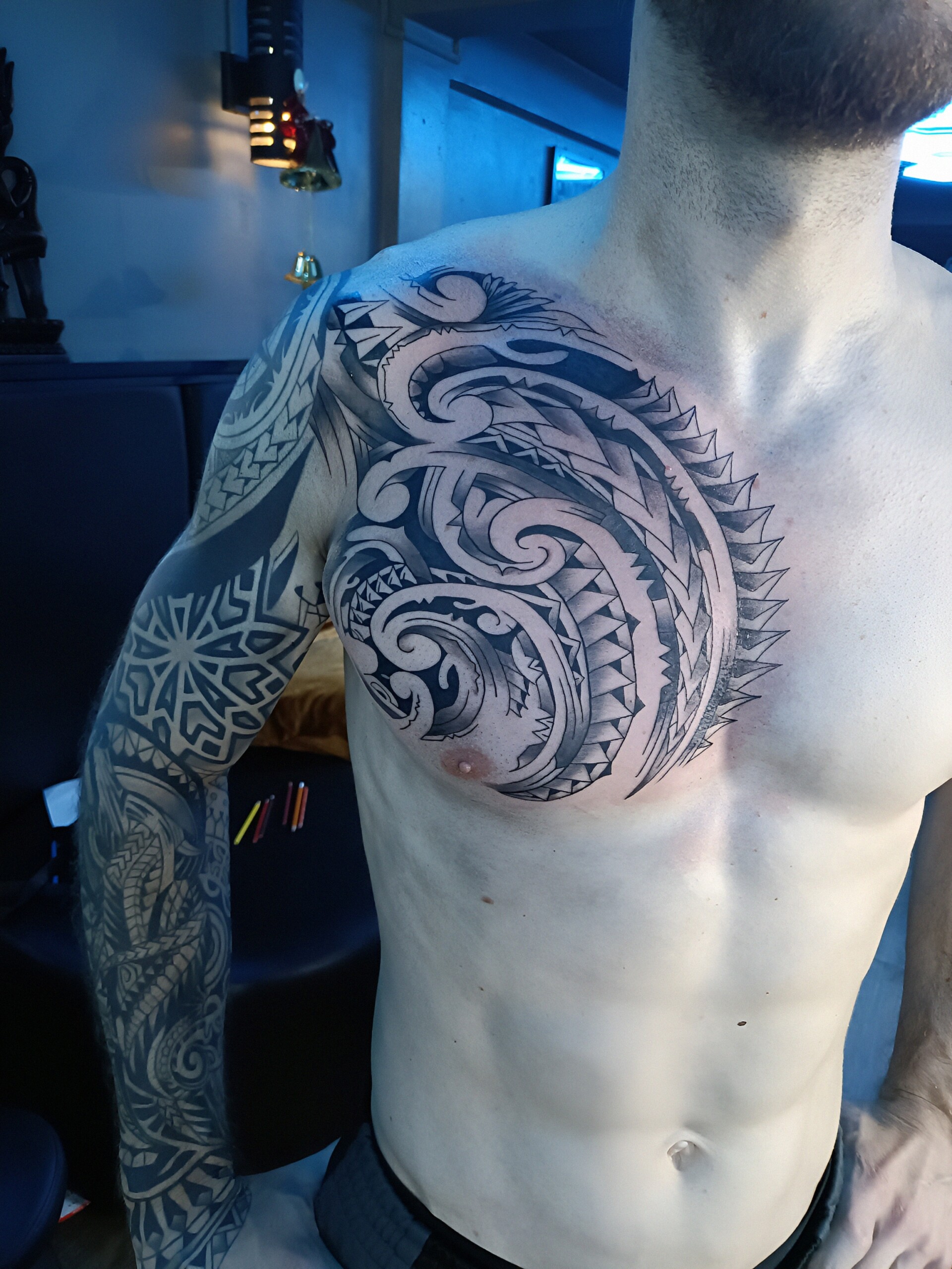 We have a wide range of Tribal Tattoo designs available to our customers, from Samoan style tribal, Maori or just straight black pattern work. Tribal Tattoos can also be freehanded onto customers by our artists.